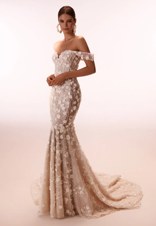 The graceful mermaid shape enhances natural curves while intricate lace detailing adds texture and depth, creating a look that is both soft and striking. Every element is designed to captivate — from the structured fit through the hips to the dramatic finish that elongates the silhouette.
