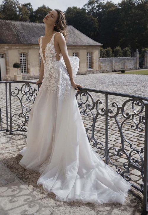 Bridget features a striking plunge neckline balanced by delicate illusion detailing at the back, offering both allure and refined support. The intricate lace continues throughout the gown, flowing seamlessly into a dramatic lace train that adds unforgettable impact as you walk down the aisle.