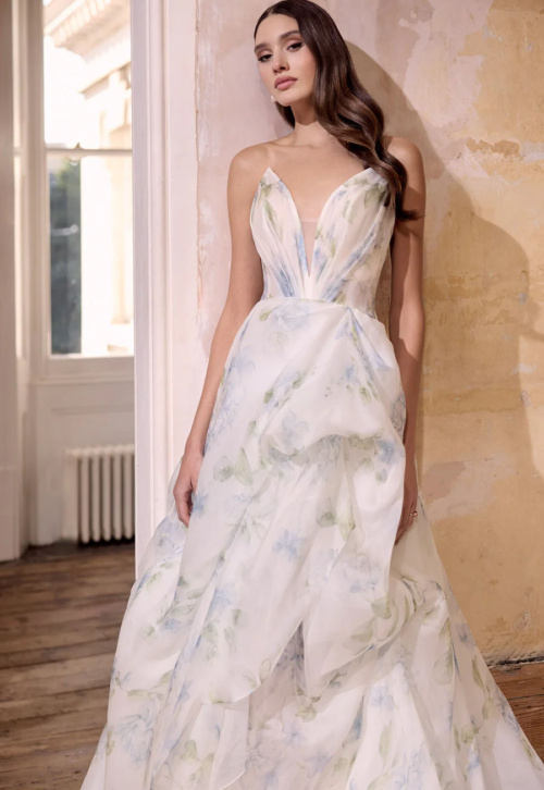 The Celeste Rose gown by Josephine Scott is a sample dress that epitomizes modern couture and timeless romance. Crafted from luxurious Italian silk mikado, this gown features a delicate pink rose print, adding a soft, feminine touch to a striking bridal silhouette.