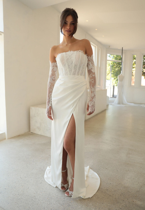 A high split adds a contemporary edge, offering both movement and allure, while the structured bodice balances femininity with architectural elegance. Vivianna is designed for the confident bride who seeks timeless luxury with a fashion-forward twist.