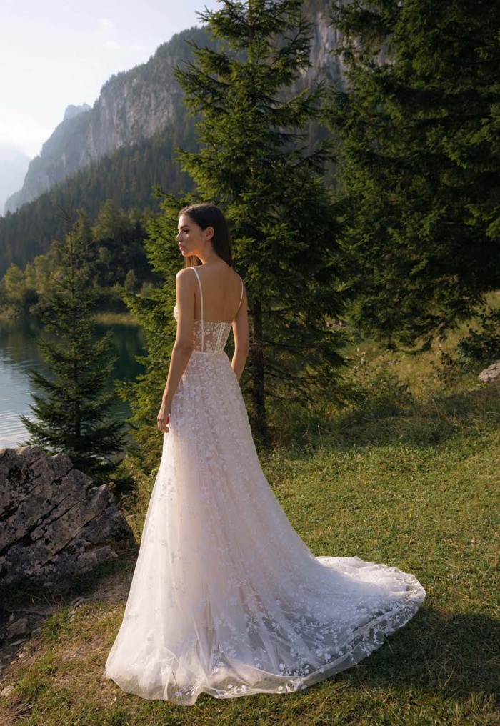 Crafted from delicate lace, this gown features a structured corset bodice that sculpts and supports, creating a feminine silhouette that’s both flattering and refined. The intricate lacework throughout the gown adds a touch of classic sophistication, while Daalarna’s signature design approach keeps the overall look effortlessly contemporary.