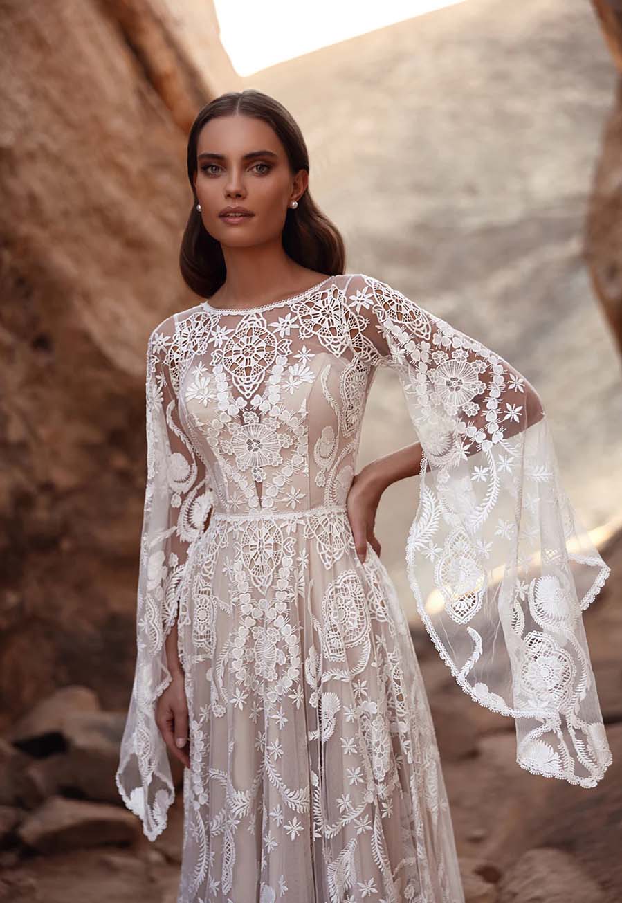 The gown features sheer long sleeves with gently flared cuffs, adding softness and bohemian ease, while the structured bodice beautifully sculpts and defines the waist. From there, the silhouette flows into a soft, fluid skirt that extends into a dramatic train, creating movement and presence from every angle.