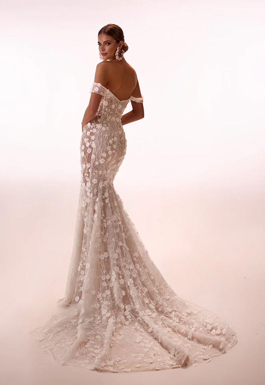The graceful mermaid shape enhances natural curves while intricate lace detailing adds texture and depth, creating a look that is both soft and striking. Every element is designed to captivate — from the structured fit through the hips to the dramatic finish that elongates the silhouette.