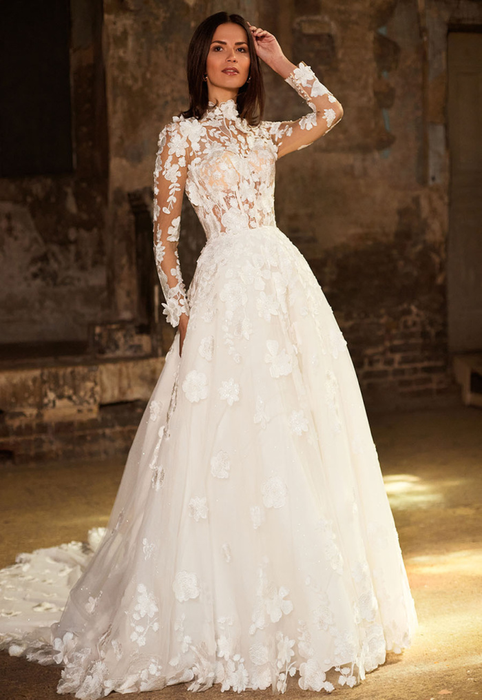 Step into fairy-tale elegance with the Idole dress by Dando London, a breath-taking ivory ball gown that embodies romance and sophistication. This worn and dry-cleaned gown features long sleeves and a high neckline, perfectly balancing modesty with modern style.