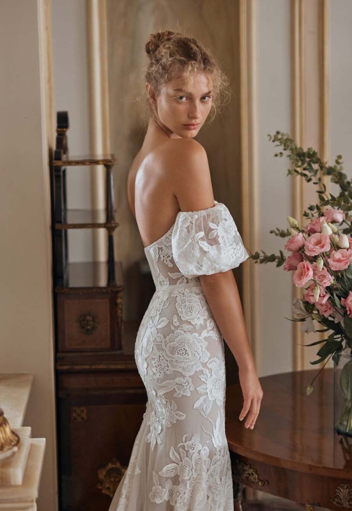 Crafted from intricate lace, Magnolia blends texture and sophistication, while an adorned belt cinches the waist to enhance the gown’s feminine shape. For added versatility and drama, the gown includes detachable puff sleeves — allowing brides to shift seamlessly from a romantic ceremony look to a sleeker, strapless reception style.