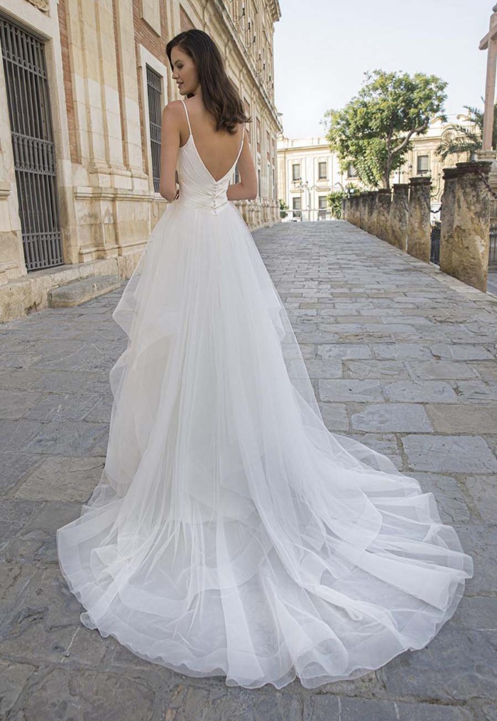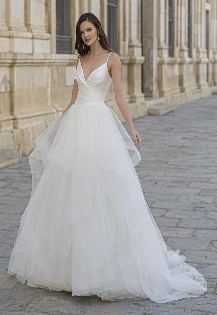 This charming A-line silhouette features a clean, side-draped Mikado bodice that gives structure and sophistication, while the flirty tiered horsehair hem skirt adds bounce, movement, and personality to your big-day look.