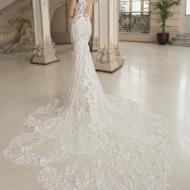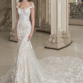 Lakme by Elysee is a curvaceous Chantilly lace mermaid style gown with flattering curved neckline and off the shoulder straps. Perfectly placed illusion side panels draw the eye to the waistline and gives the illusion of it being smaller. Who doesn’t love a tiny waist?