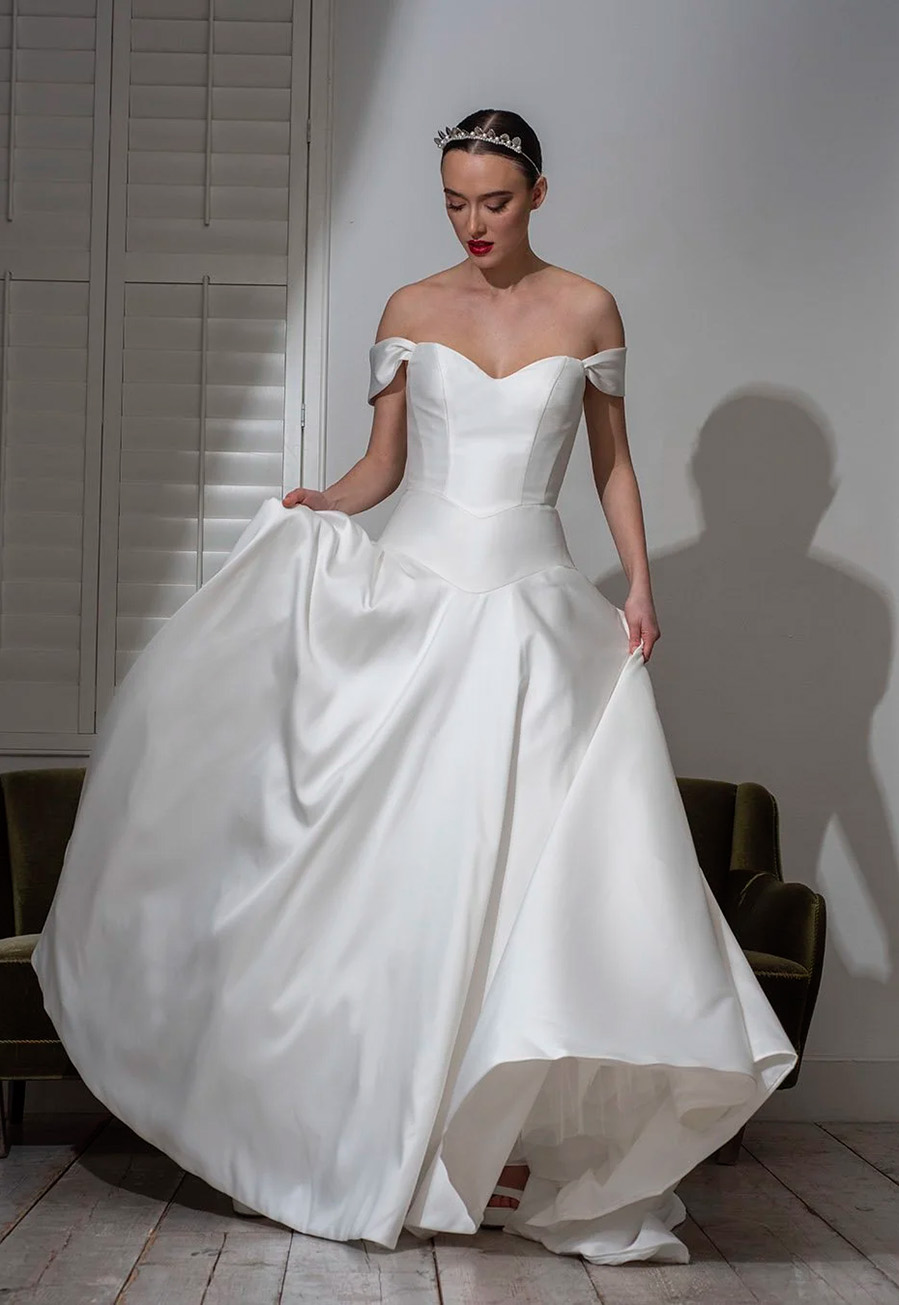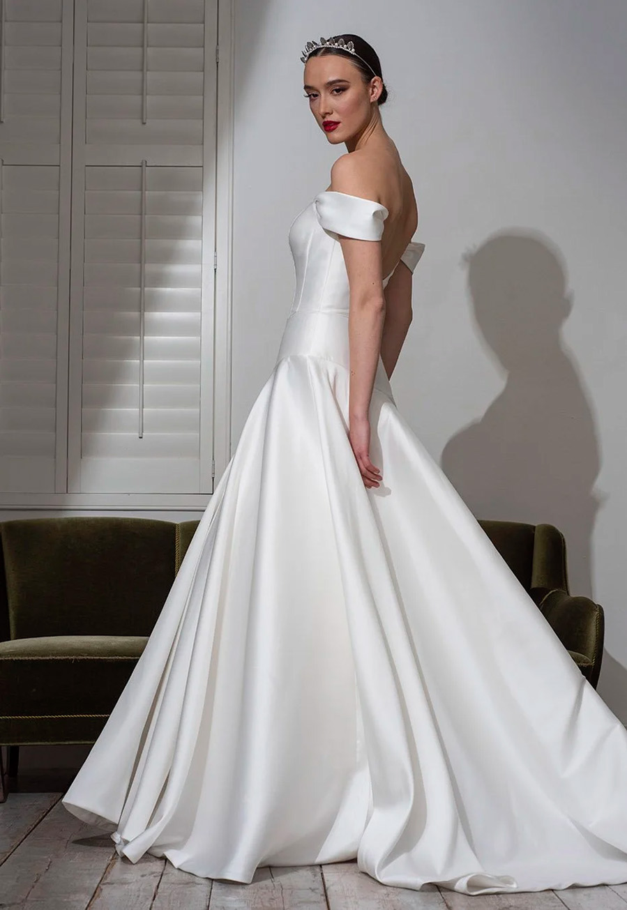 The Aura gown by Freda Bennet is a striking sample dress that blends contemporary elegance with timeless bridal drama. Crafted from luxurious zibeline, the gown offers a structured yet beautifully refined finish.