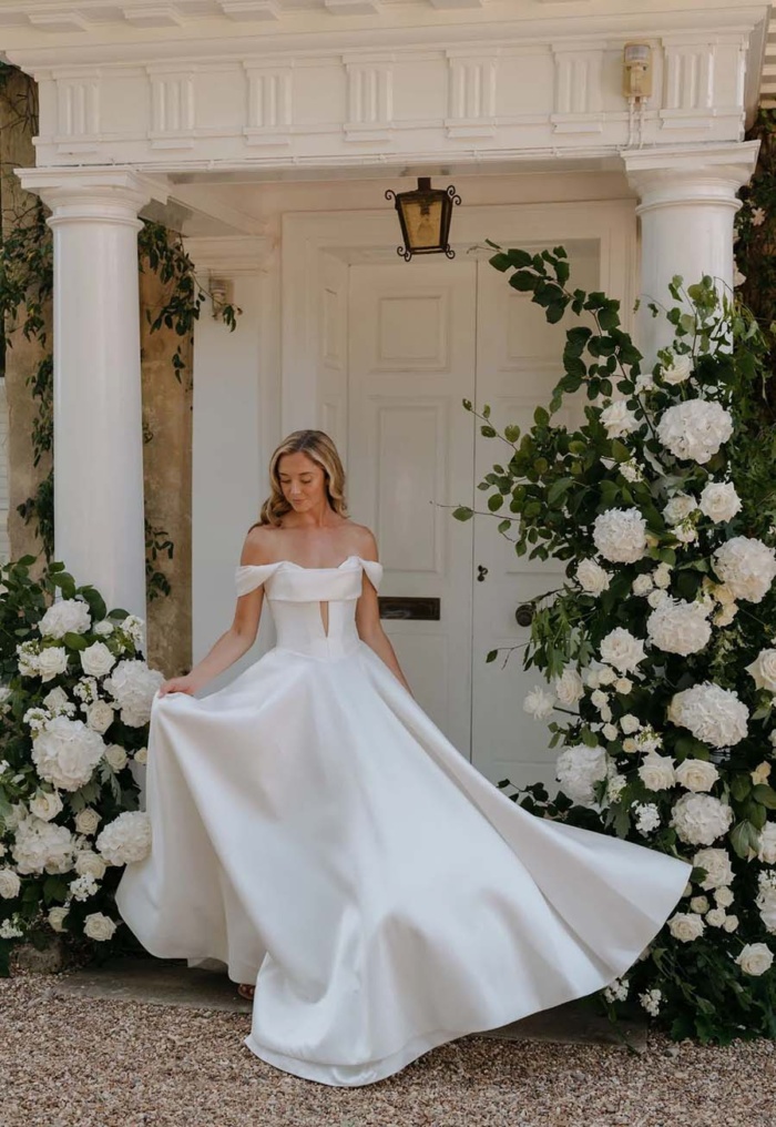 The structured bodice flatters the figure while offering subtle support, perfectly balanced by the softness of the airy skirt that moves beautifully with every step. Crafted with luxurious fabrics and couture detailing, ‘Bianca’ is ideal for garden weddings, elegant ceremonies, or any bride dreaming of a whimsical yet refined bridal look.