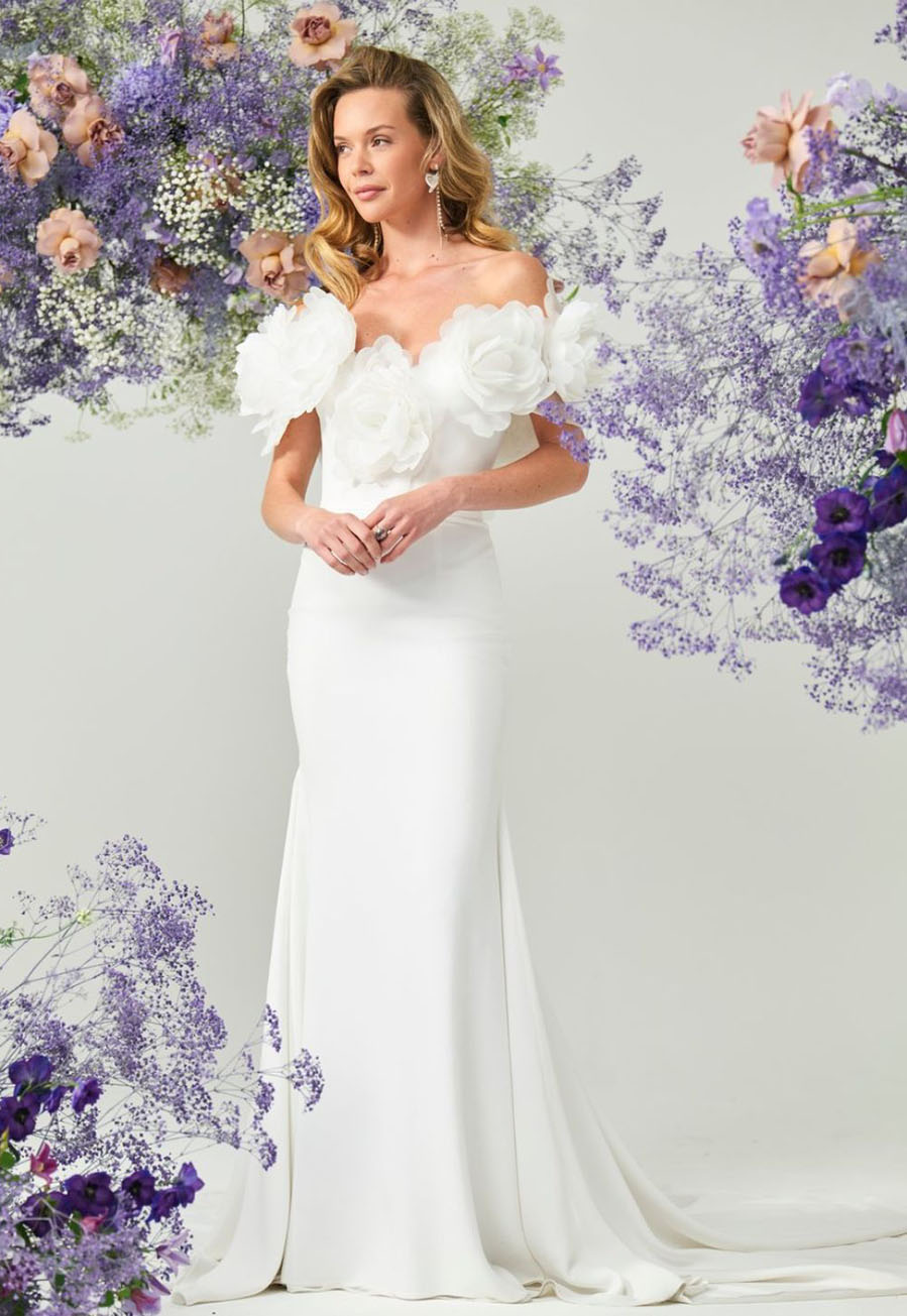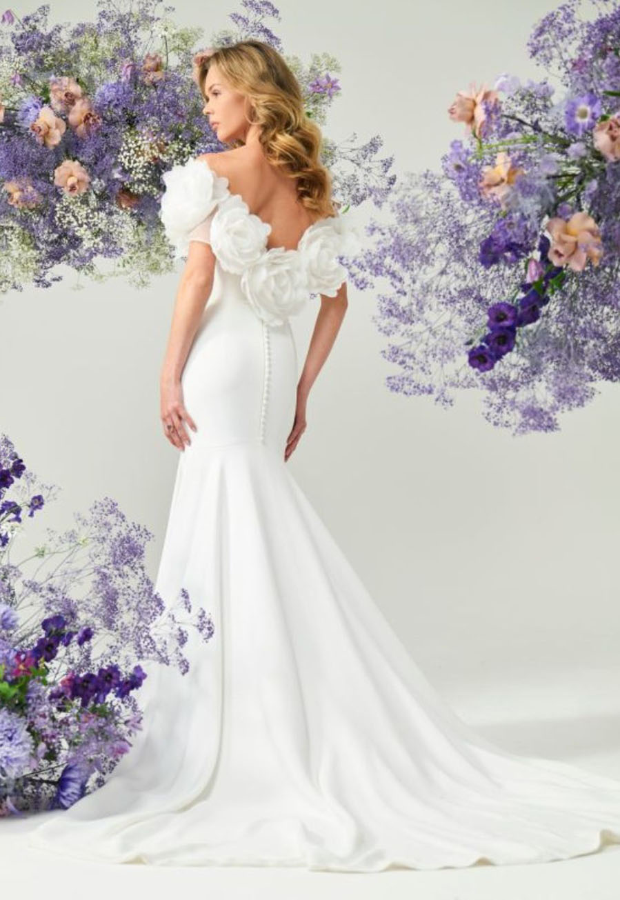 Delicate 3D floral appliqués adorn the neckline and arms, gracefully extending over the back to create a dramatic, breathtaking focal point. The combination of clean tailoring and sculptural floral details ensures a modern, yet romantic statement for your wedding day.
