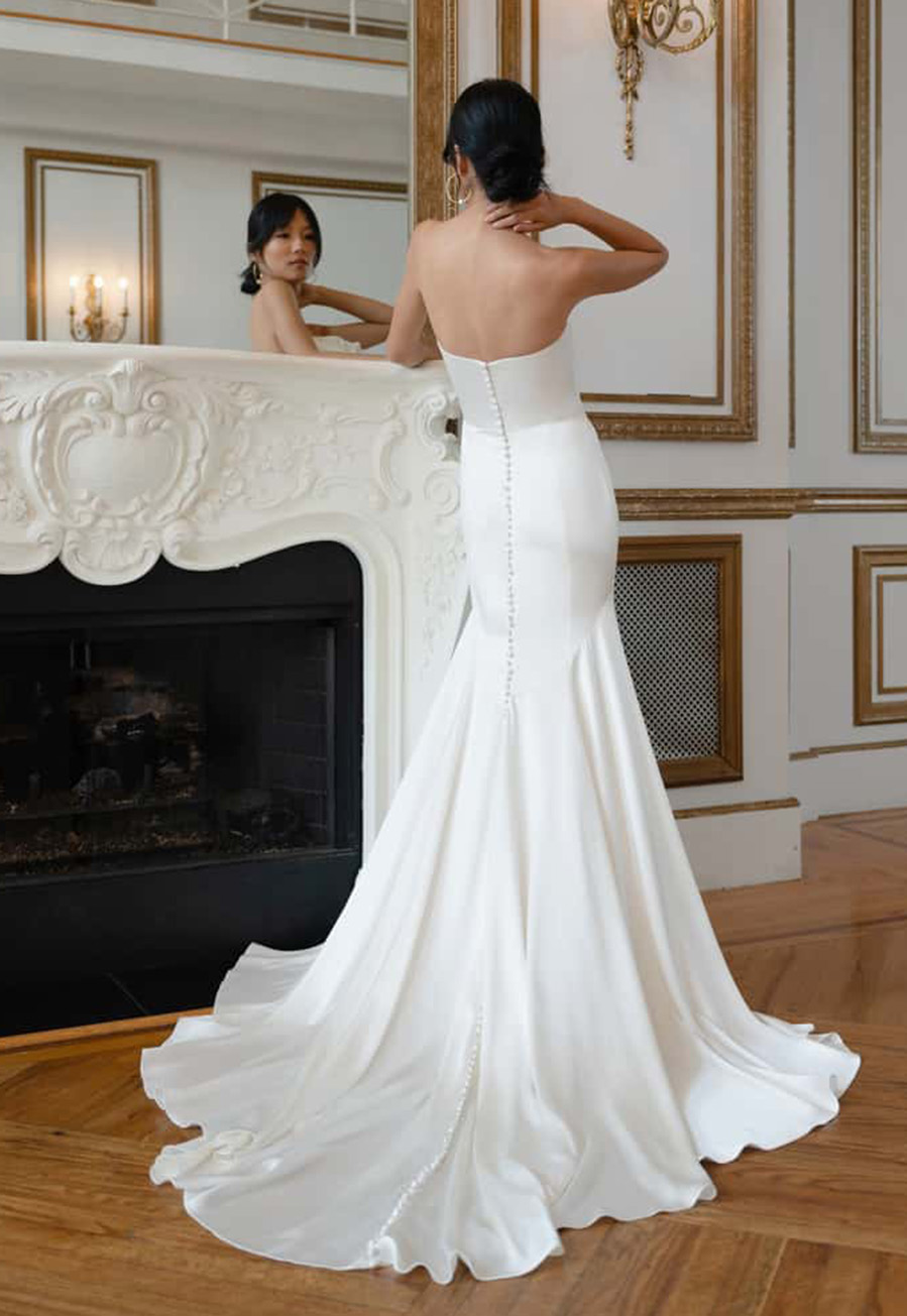 At the back, fabric-covered buttons run down the gown, adding a timeless finishing touch that enhances the classic bridal aesthetic.