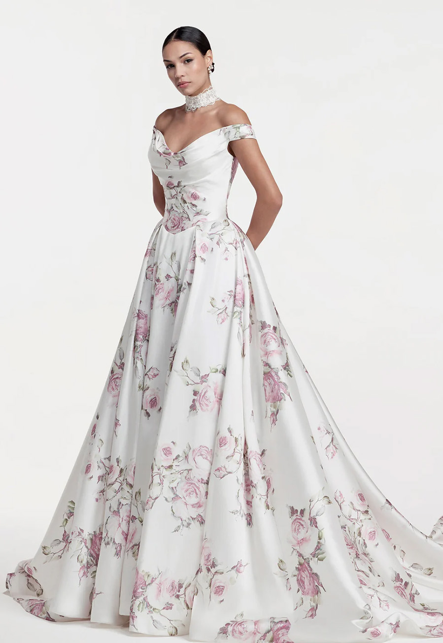 The Celeste Rose gown by Josephine Scott is a sample dress that epitomizes modern couture and timeless romance. Crafted from luxurious Italian silk mikado, this gown features a delicate pink rose print, adding a soft, feminine touch to a striking bridal silhouette.