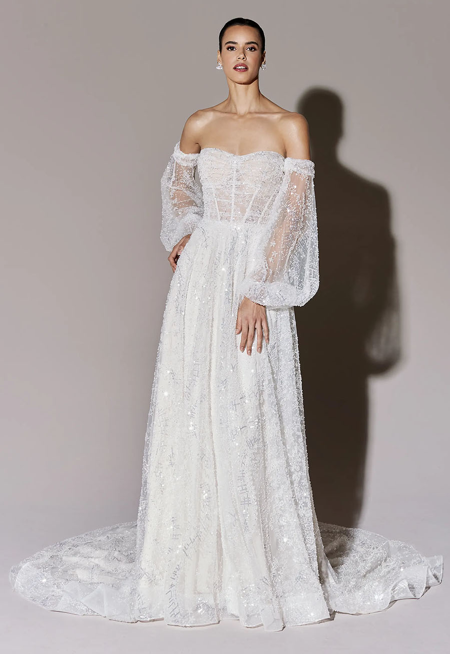 For versatility, detachable puff sleeves allow you to transform the dress from a strapless look to a statement-making, dramatic style. Perfect for the bride seeking timeless elegance with modern flair, Afterglow combines sparkle, movement, and couture detail in a ready-to-wear Justin Alexander sample gown.