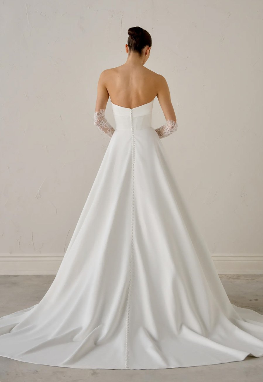 The standout feature is the strapless asymmetrical cuff neckline, a sculptural detail that adds architectural drama while framing the shoulders with refined sophistication. The simplicity of the fabric allows the tailoring and silhouette to take centre stage, resulting in a look that feels both timeless and fashion-forward.