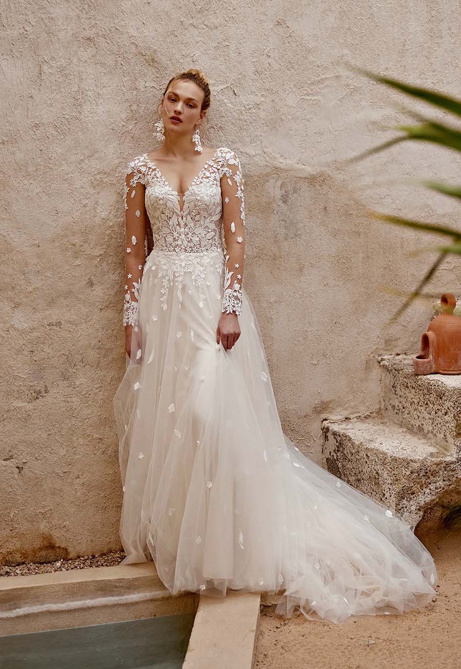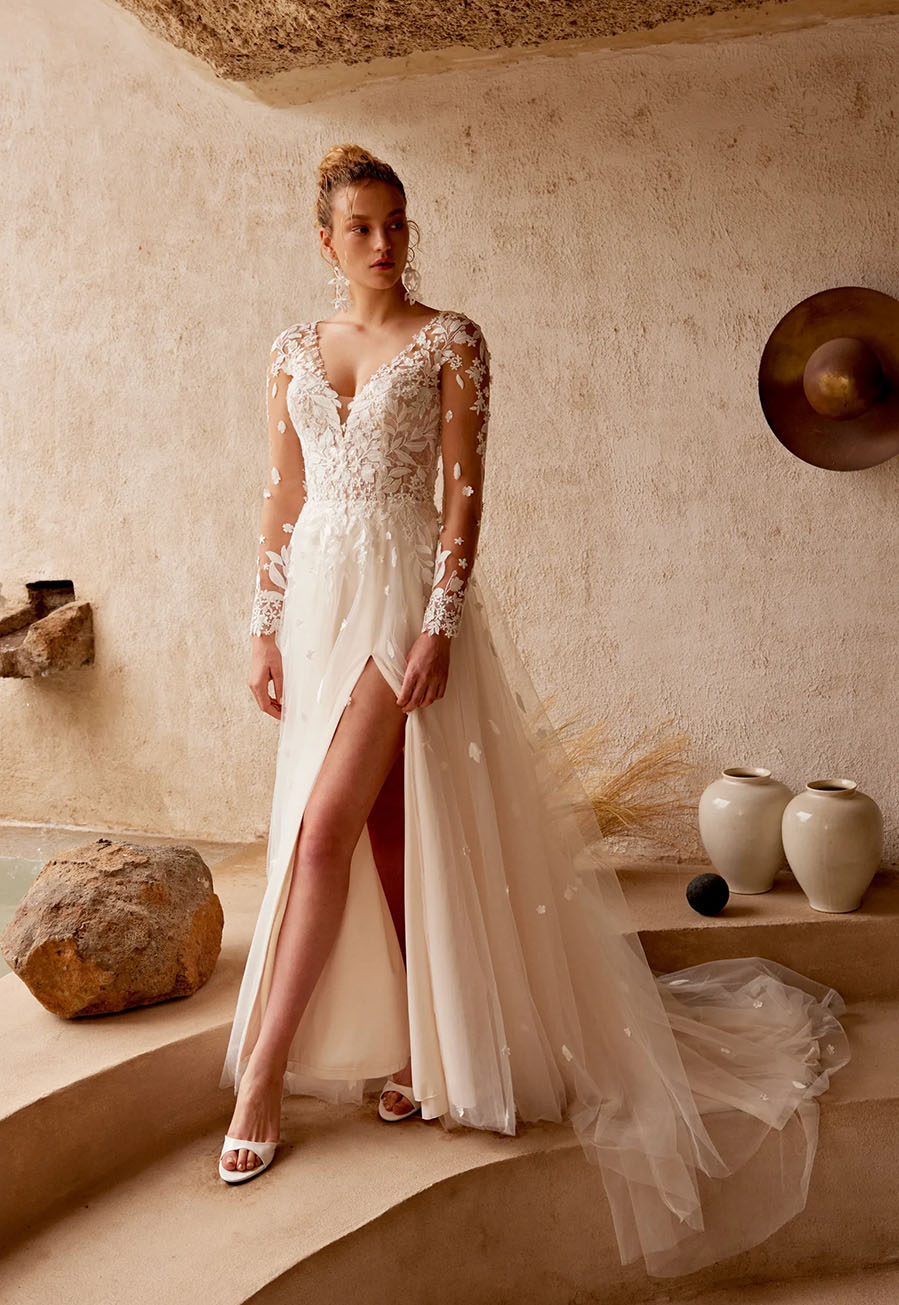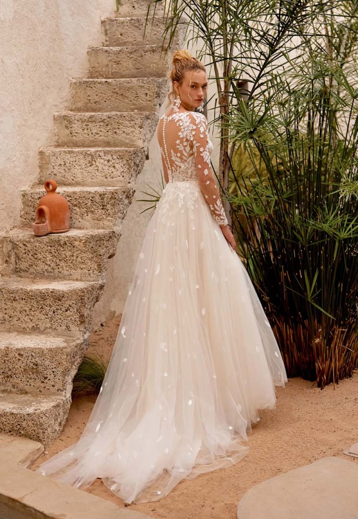 This dreamy A-line silhouette is crafted from soft, flowing tulle and features a plunging V-neckline, long sheer sleeves, and a flattering natural waistline. Intricate lace appliqués and delicate embroidery bring eye-catching detail throughout, while the standout feature is the stunning high illusion back, creating an unforgettable look from every angle.