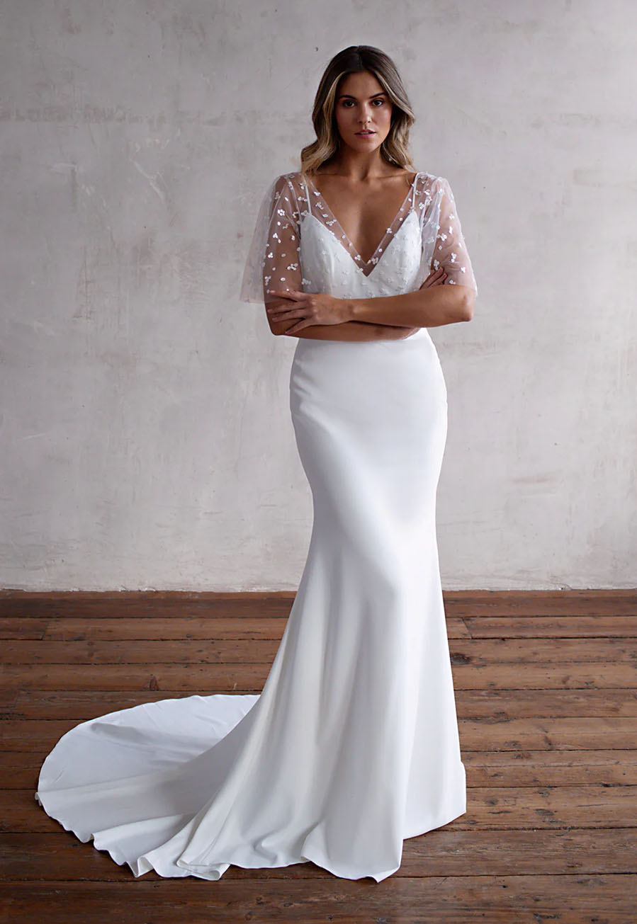 At its core, the gown offers a sleek and elegant silhouette, perfect for a timeless bridal look. What makes Charlie truly special is its removable polka dot lace jacket and overskirt, allowing you to transform your style throughout the day. Wear the full look for a statement ceremony entrance, then remove the layers to reveal a more minimal, contemporary silhouette for your reception.