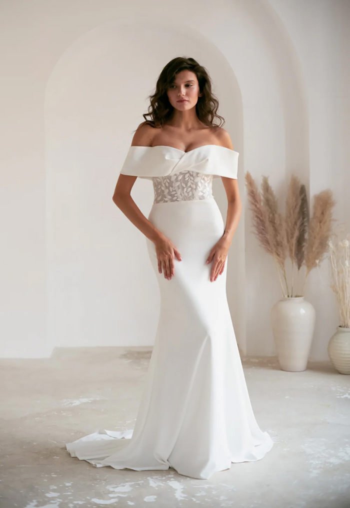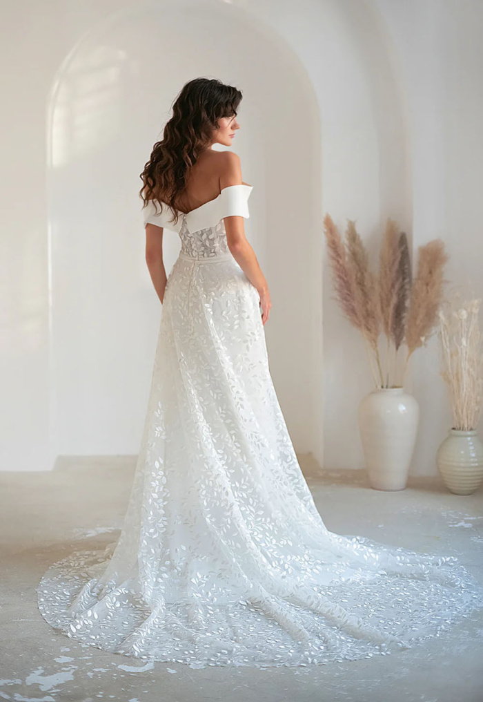 A sheer, embroidered centre with corset boning sets this gown apart, providing both support and fashion-forward detail. The feminine twisted off-the-shoulder collar adds playful elegance, while the breath-taking detachable skirt at the back showcases bohemian-inspired satin-stitch leaves — perfect for a dramatic aisle entrance and effortless reception transition.