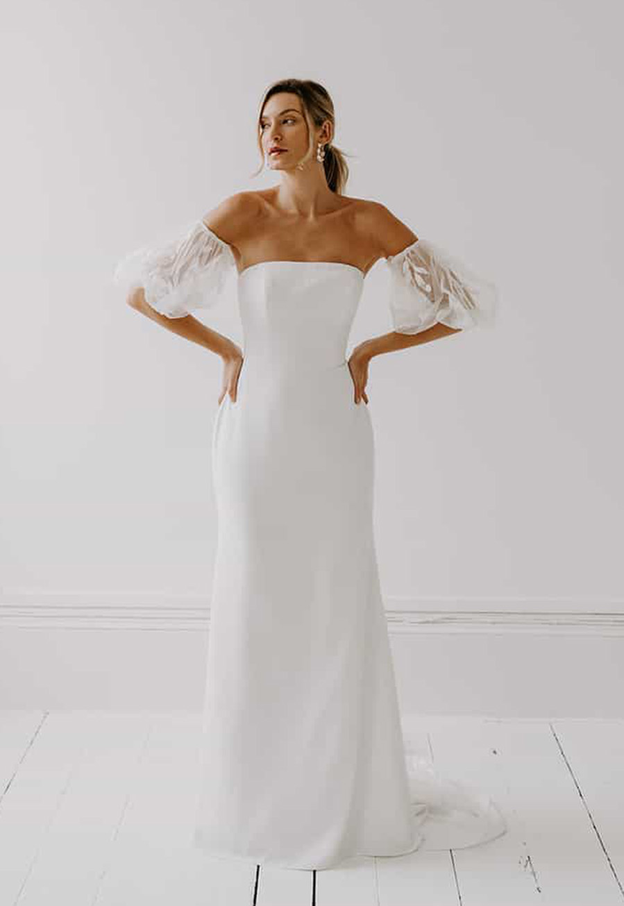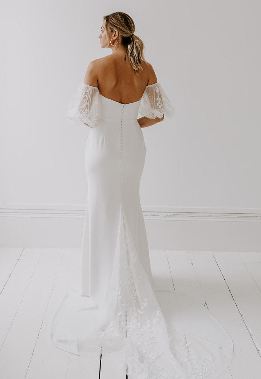 The gown features a sleek strapless straight neckline, creating a timeless and contemporary silhouette. The standout feature is the addition of sheer Marcia sleeves with delicate floral detailing, offering a soft, romantic contrast to the clean lines of the gown.