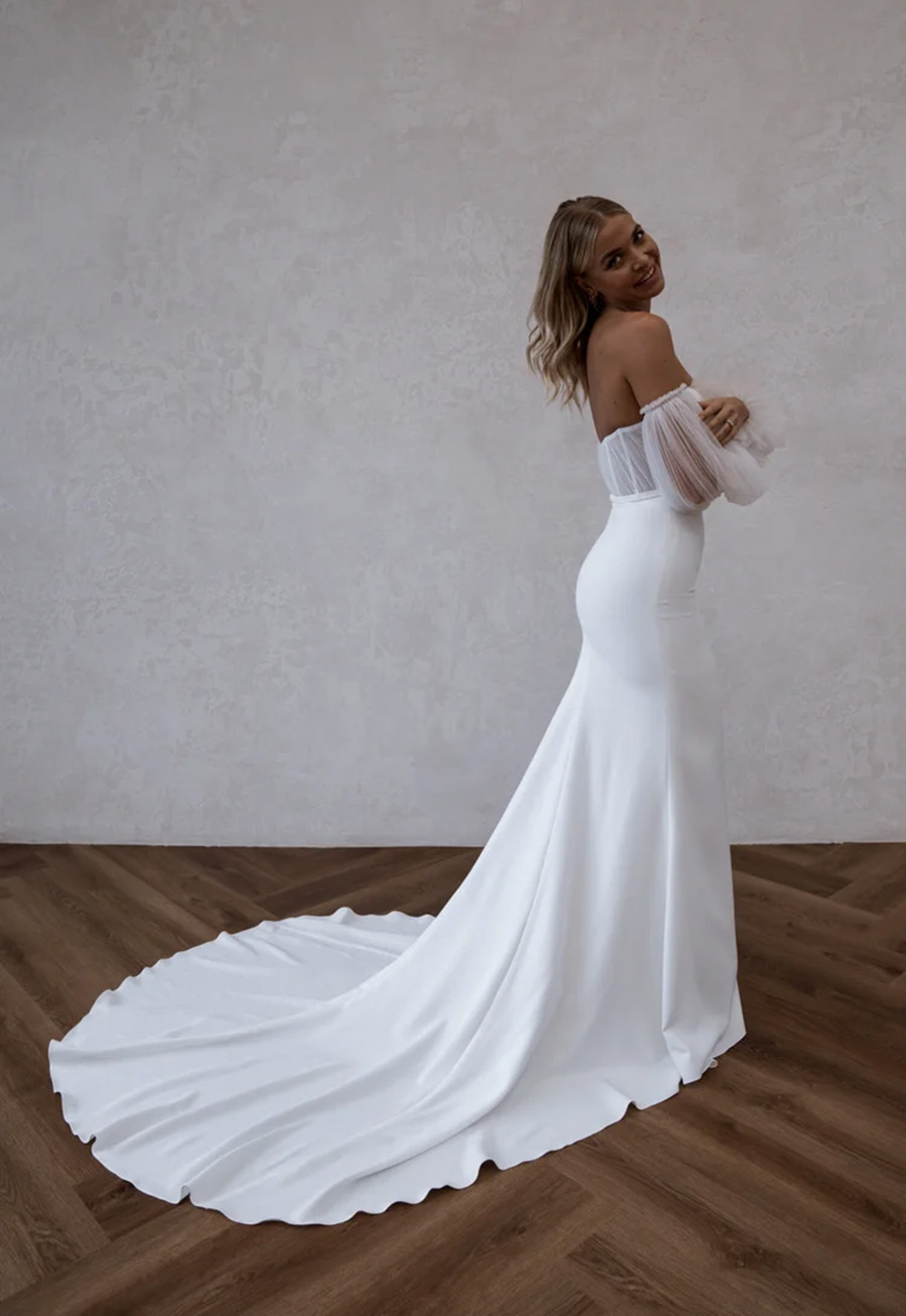 Say hello to Pippa by Made with Love, a once-worn, professionally dry-cleaned wedding gown that embodies modern romance with a touch of whimsy. Crafted from buttery soft crepe, Pippa’s fitted skirt hugs your curves flawlessly, creating a sleek and feminine silhouette that feels both elegant and effortless.