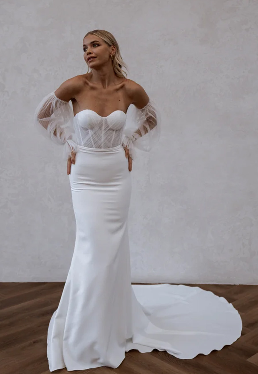 Her luxurious pleated tulle bodice adds delicate texture and charm, perfectly complemented by her detachable puffy tulle sleeves. These ethereal sleeves bring just the right amount of coverage while adding a playful, fashion-forward statement to the look.