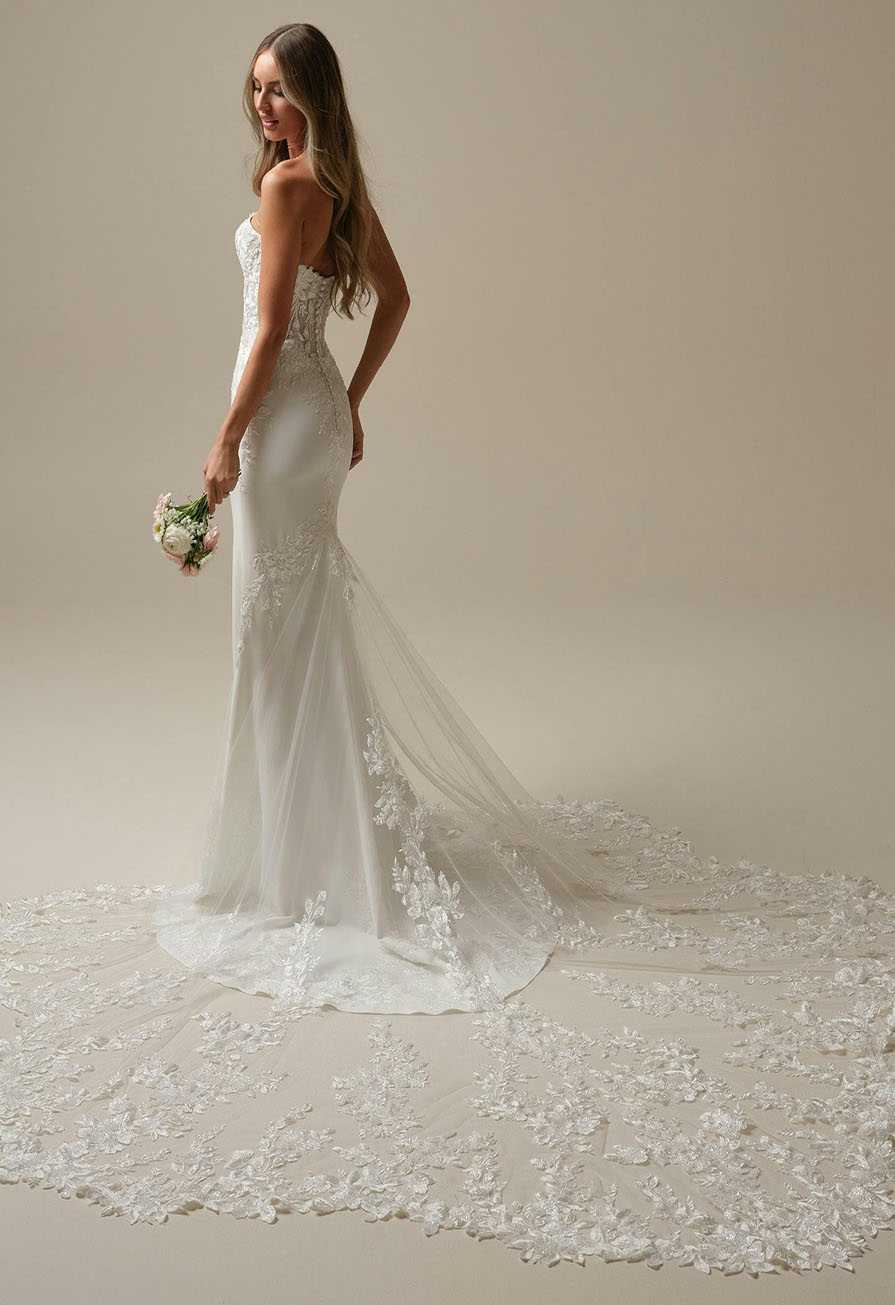 Finished with covered buttons over a zipper closure and an extended scalloped illusion lace train, Yara delivers an ethereal, elongated bridal look that feels both contemporary and classic.