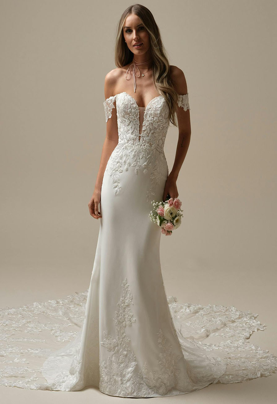 The Yara wedding dress by Maggie Sottero is a beautifully balanced blend of boho spirit and timeless elegance, offered here as a sample gown and ready to wear. Designed in luxurious Sherwood crepe, this sleek sheath silhouette skims the body in a super flattering way while maintaining effortless sophistication.