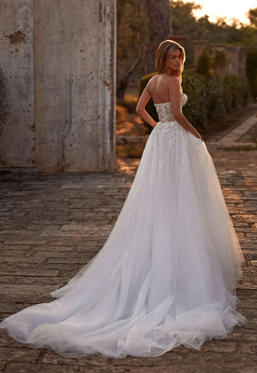 The voluminous maxi tulle skirt flows gracefully from the corset, adding a magical princess-like aura to the overall look and creating stunning movement as you walk down the aisle.