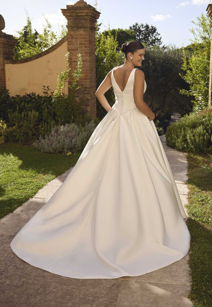 Practical yet stylish, hidden pockets add a contemporary twist, while a delicate row of buttons cascading down the back provides a timeless bridal detail. Perfect for brides seeking a sophisticated, modern gown that balances classic charm with fashion-forward design.