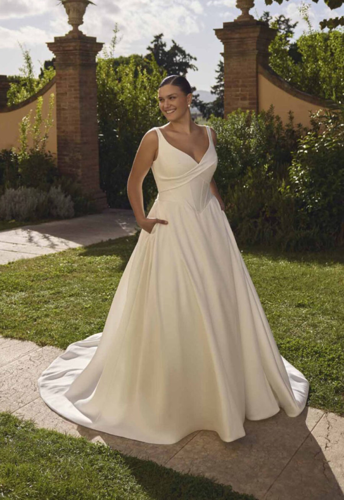 Designed for the curvy bride who embraces simplicity with impact, the Modeca Curves ‘Janneke’ gown is a stunning minimalist ballgown crafted from luxurious mikado fabric. Its clean lines and structured basque waist beautifully enhance your natural silhouette, creating a look of confident elegance.