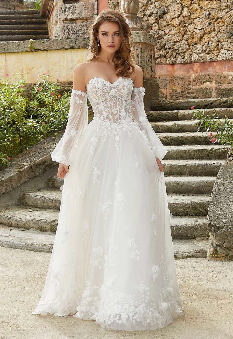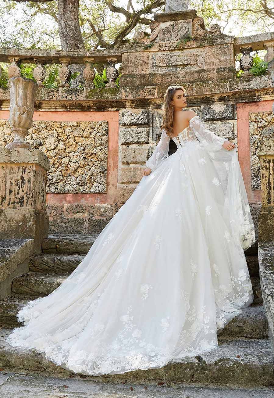 The lace-up corset back ensures a perfect fit, while dramatic bishop sleeves add a romantic, storybook-inspired touch. Every detail of Fiorella exudes timeless romance and modern whimsy, making it ideal for brides dreaming of a magical entrance.