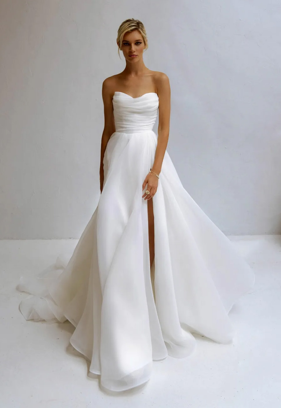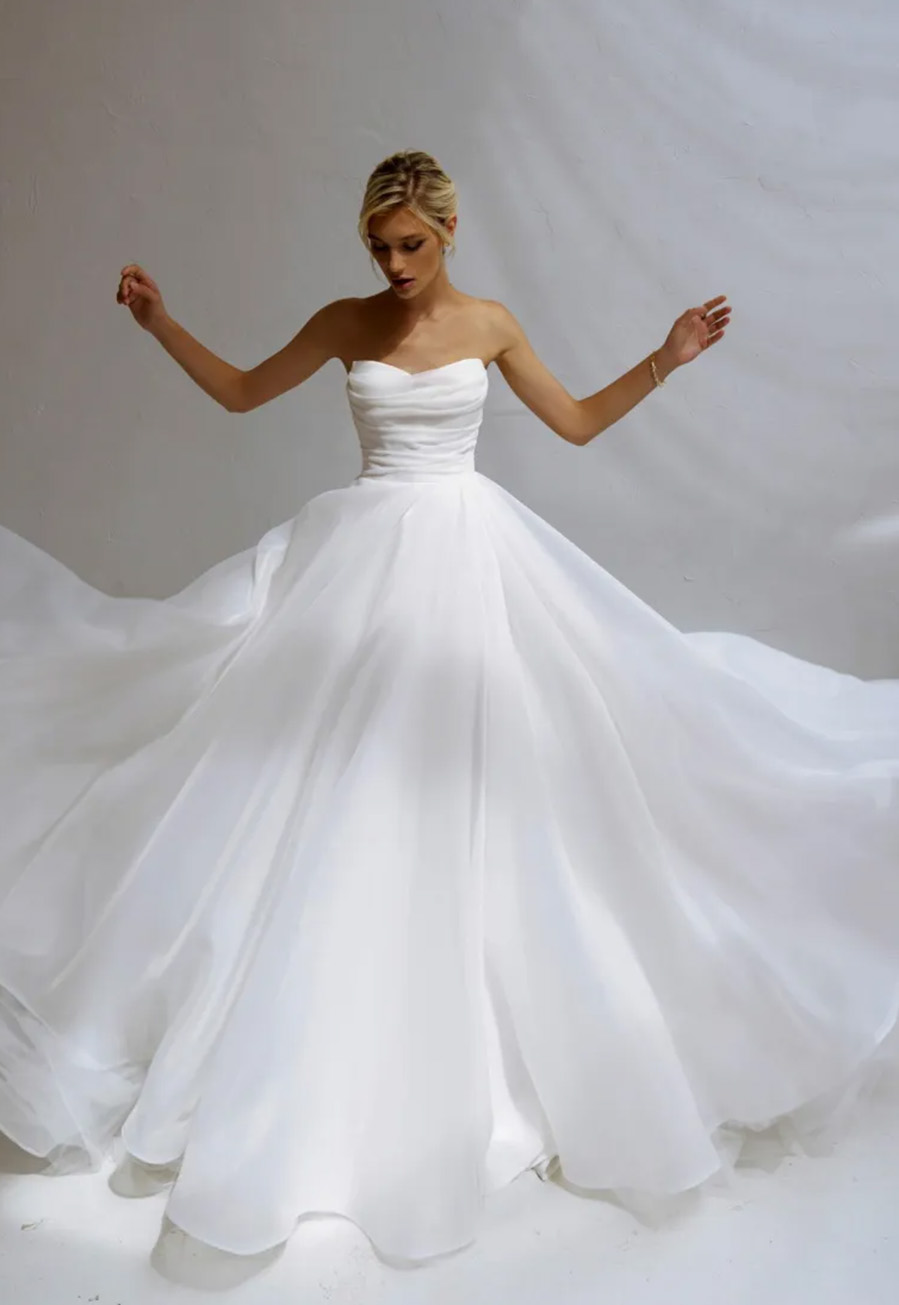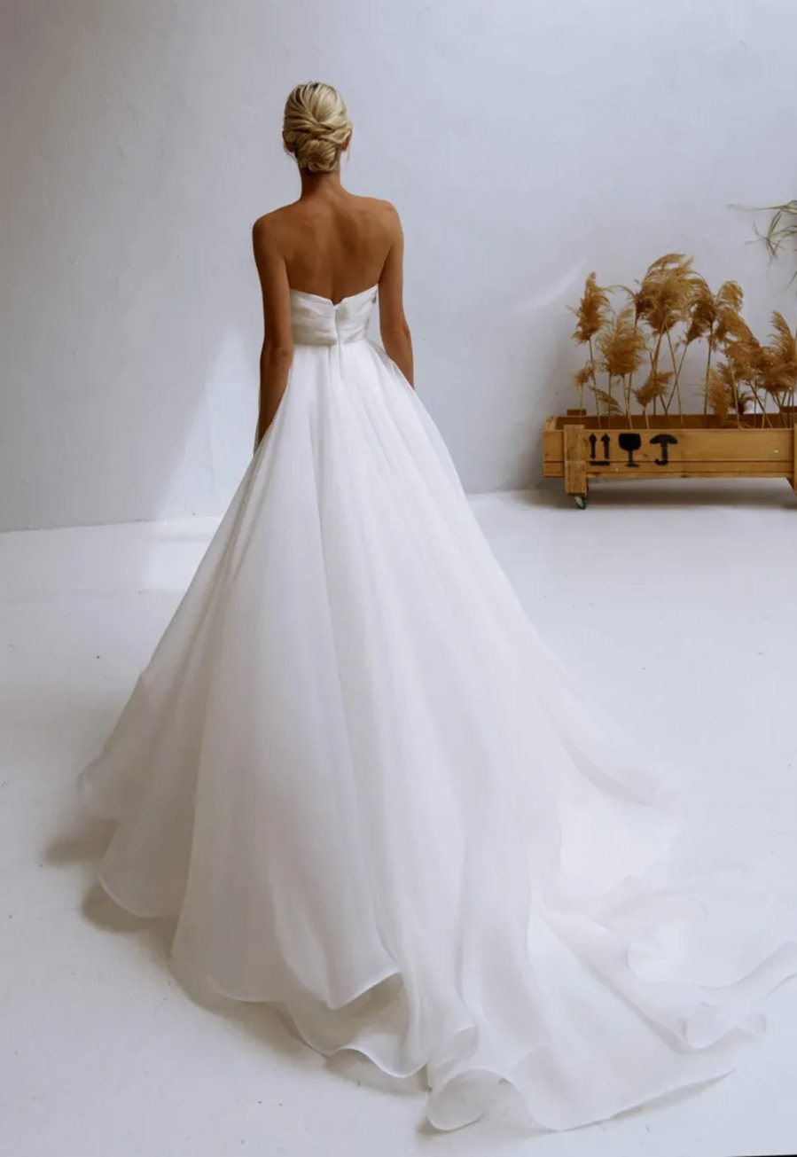 The Lovely gown by Natalia Romanova is a pre-loved but unworn wedding dress designed for brides who want effortless elegance with a romantic, modern touch. Crafted from soft, flowing organza, this strapless A-line silhouette moves beautifully with every step, creating an ethereal bridal aesthetic.