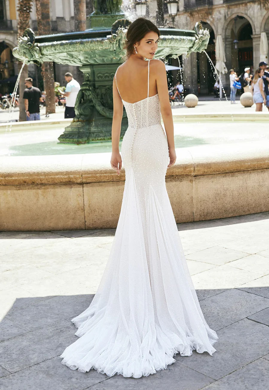 Step into timeless glamour with Sahara by Veni Infantino for Ronald Joyce, a worn wedding gown that sparkles from every angle. Crafted from glitter tulle and adorned with exquisite pearl beading, this fit-and-flare design highlights your figure while exuding modern sophistication.