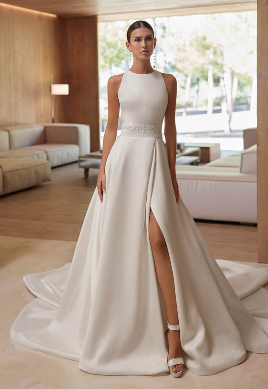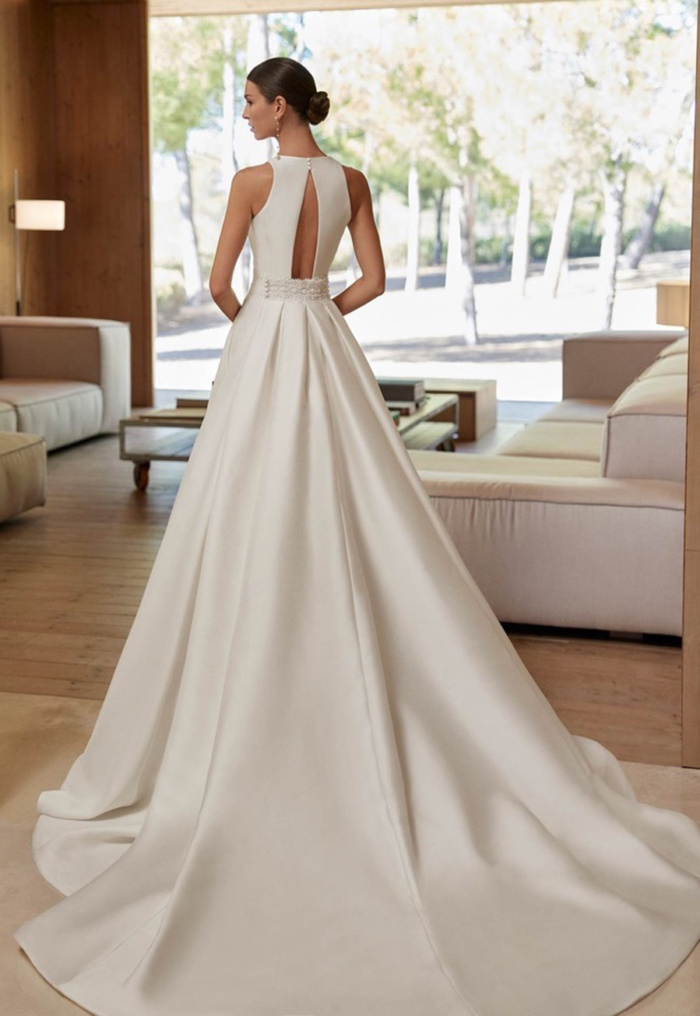 Meet Ares by Rosa Clara, a worn wedding gown designed for modern elegance with timeless sophistication. Crafted from luxurious mikado, this A-line dress features a halter neckline and exquisite beaded lace detailing at the waist, drawing attention to your natural silhouette.