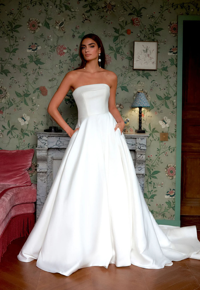 The full circular skirt is both dramatic and functional, complete with hidden pockets for modern practicality, while a row of covered buttons cascades down the back to finish the chapel-length train with understated glamour.
