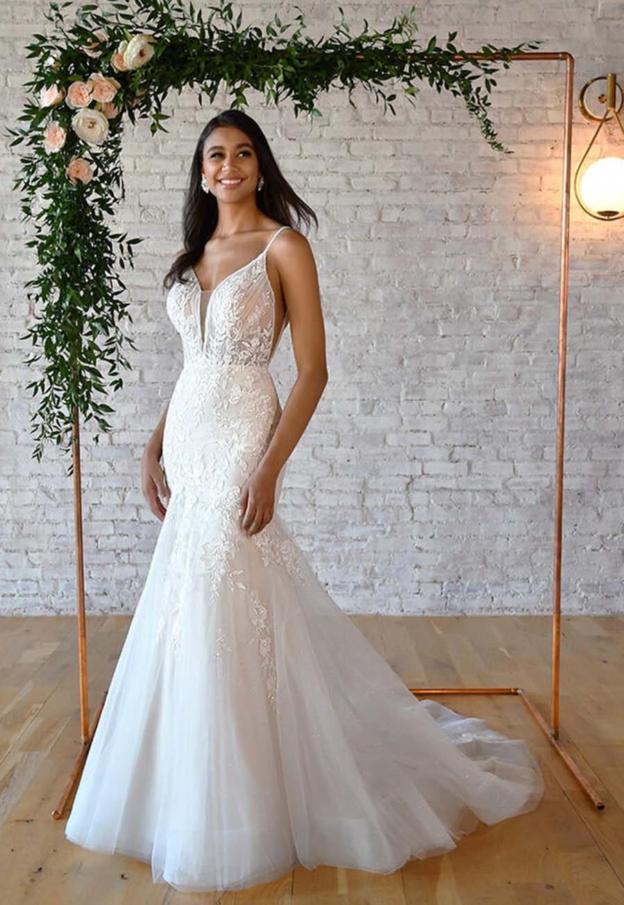 Meet Stella York 7388, an unworn wedding gown that perfectly blends romance, timeless elegance, and a touch of sexy sophistication. This fit-and-flare style features a plunging V-neckline with illusion tulle for discreet coverage and all-day comfort.