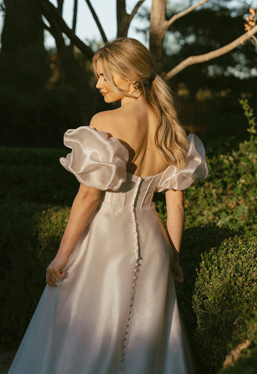 Meet Style 7940 by Stella York, an unworn wedding gown designed for brides who dream of sophistication, glamour, and princess-worthy elegance. This pearl organza ballgown features detachable off-the-shoulder puffy sleeves that sit gracefully from mid-upper arm to elbow, offering a romantic, on-trend statement.