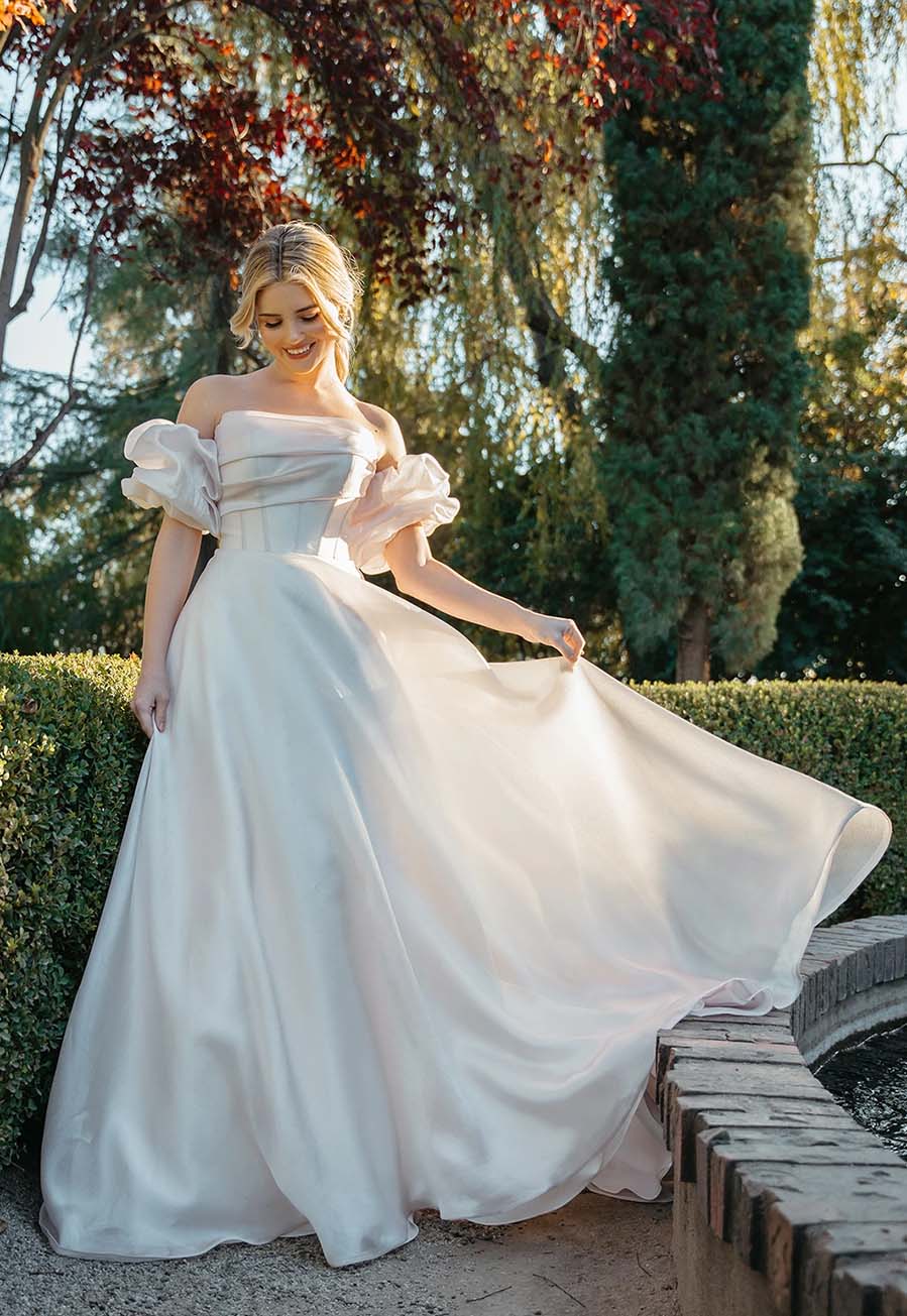 The strapless draped bodice showcases a straight-across neckline with structured corset boning, beautifully enhancing the natural hourglass figure. From the waist, the lustrous organza skirt flows into a full princess silhouette, complete with discreet side pockets and a row of fabric-covered buttons down the back for a classic finishing touch.