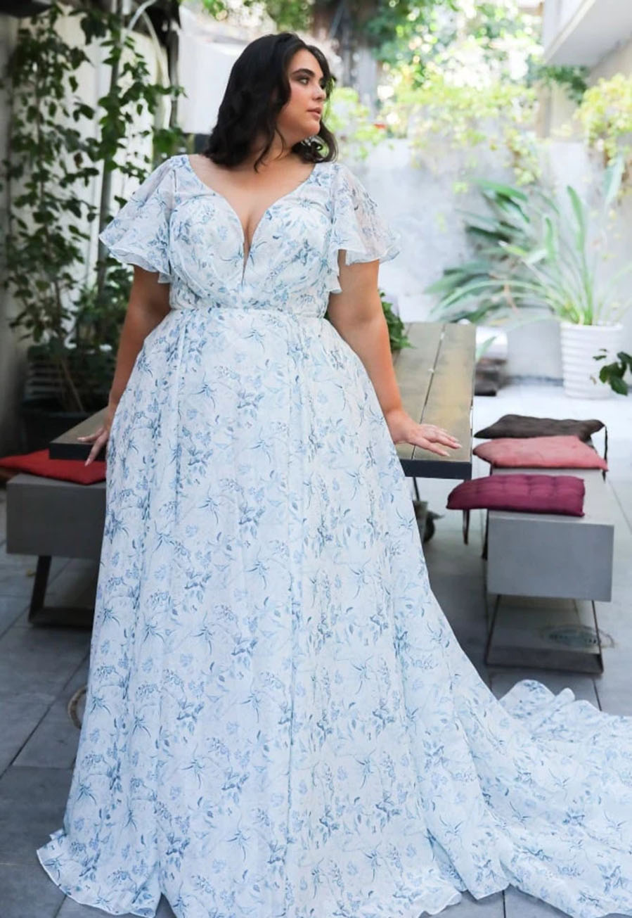 A deep neckline adds drama while light bell sleeves create a dreamy, flowing effect. The flattering A-line shape moves effortlessly into a long, sweeping train, ensuring a breathtaking entrance from every angle.