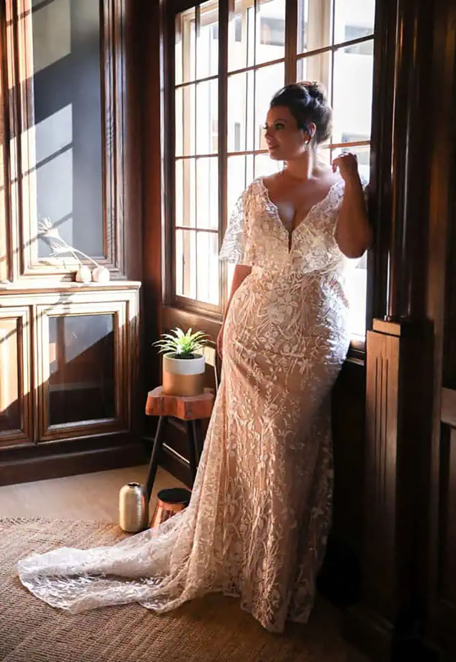 Step into timeless romance with the Velaris Mermaid gown by Studio Levana, a sample gown designed for brides who want to feel like a goddess on their wedding day. Crafted from romantic floral lace, this mermaid silhouette gracefully hugs the figure, accentuating curves while maintaining elegant structure.