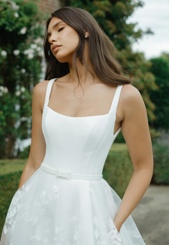 Timeless elegance meets modern romance in the ‘Moonlight’ gown by Suzanne Neville – pre-loved and professionally dry-cleaned. With Suzanne’s signature structure, the corseted bodice flatters and supports, featuring a chic square neckline and simple shoulder straps for an effortlessly graceful look.