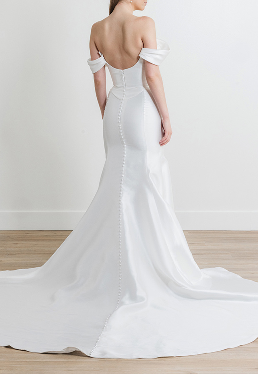 Finished with covered buttons trailing down the back, this gown delivers a timeless bridal touch that complements its clean, contemporary design.