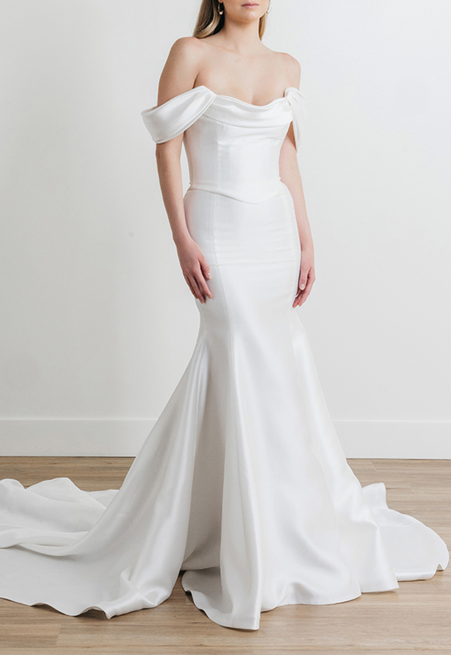 The gown features detachable shoulder drapes, adding a graceful, flowing element that enhances the neckline and offers versatile styling. Whether worn for the ceremony or removed for a sleeker reception look, Agape allows for effortless transformation throughout your day.