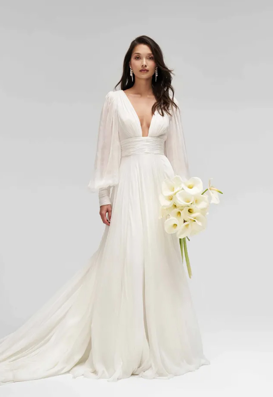 The gown features billowing sleeves that add soft drama and movement, perfectly complementing the airy fabric. A refined notch-front neckline introduces a modern touch, while the self-tie sash gently defines the waist for a flattering and feminine shape.